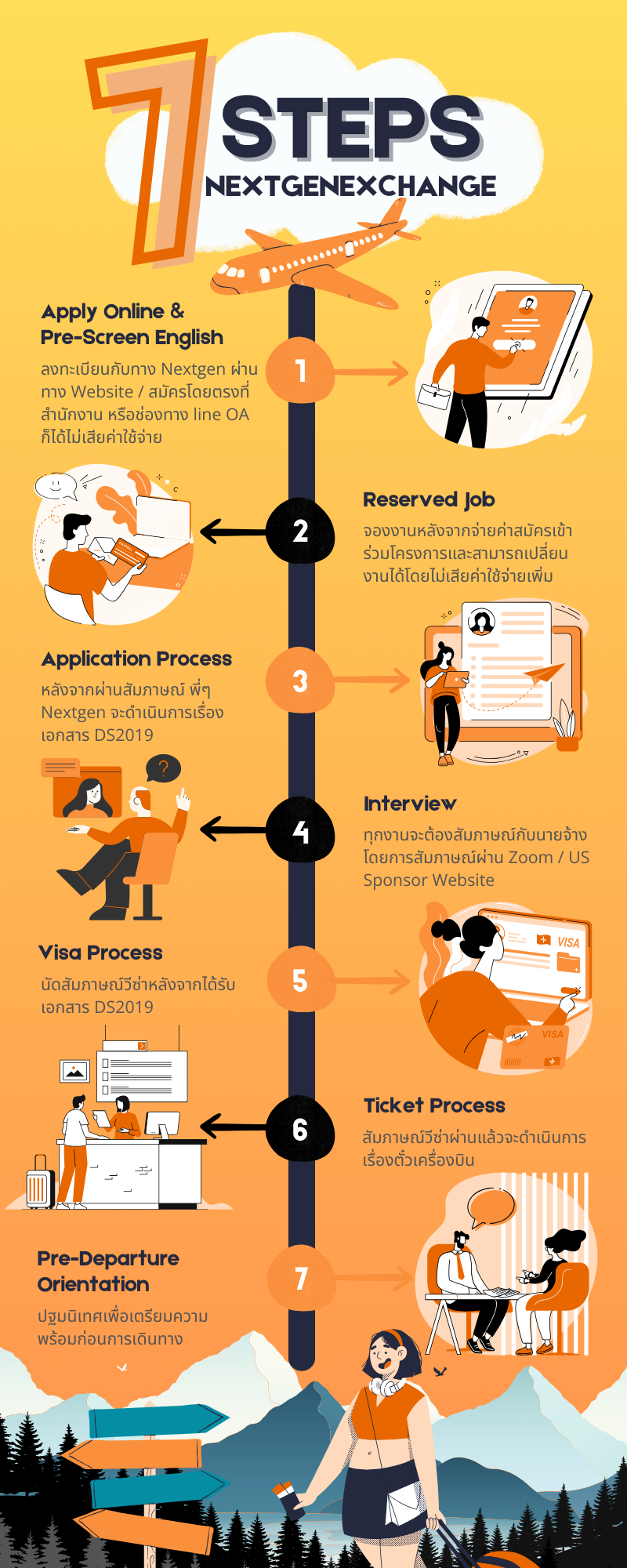 โครงการ Work and Travel USA เป็นโครงการแลกเปลี่ยนวัฒนธรรม (Cultural Exchange) ที่เปิดโอกาสให้นิสิต นักศึกษา ระดับอุดมศึกษา ทุกชั้นปี ได้มีโอกาสได้เดินทางไปประเทศสหรัฐอเมริกา ช่วงปิดภาคเรียน เพื่อทำงานกับบริษัทชั้นนำ และท่องเที่ยวเพื่อหาประสบการณ์ และเรียนรู้วัฒนธรรมของชาวอเมริกัน โดยนิสิตนักศึกษาที่เข้าร่วมโครงการ Work and Travel USA กับ Nextgen จะได้รับวีซ่าประเภท J-1 ซึ่งเป็นวีซ่าสำหรับเยาวชนในโครงการแลกเปลี่ยนวัฒนธรรมที่ให้สิทธิ์เยาวชนในการทำงานและท่องเที่ยวในประเทศสหรัฐอเมริกา ได้อย่างถูกต้องตามกฎหมายภายใต้เงื่อนไขและระยะเวลาที่กำหนดคือไม่เกิน 4 เดือน และนักศึกษาสามารถอยู่พำนักในประเทศสหรัฐอเมริกาเพื่อท่องเที่ยวได้อีกสูงสุด 28 วันหลังสิ้นสุดการทำงาน